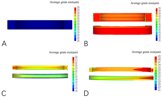 Grain size distribution of 2219 aluminum alloy during ring tying: (A) Drive roll bite stage, (B) Vertebral roll bite stage, (C) Stable rolling stage, and (D) Rolling completion stage.