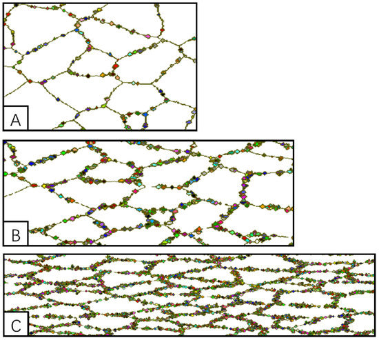 A selected point on the inner wall of the ring member is used as a reference point for the study, and the simulation data from this point are imported into a cellular automata to observe the simulation process of its microstructural transformation. Figure 13 shows the nucleation and recrystallization of the grains during the simulation. At the beginning of the rolling, the grain shape does not change significantly, as the rolling stage proceeds, in the stage of the driver roller and cone roller bite in. When dislocation density increases to critical dislocation density, a new nucleus appears at the grain boundary of the initial grain, as shown in Figure 13A; this stage is called dynamic recrystallization nucleation stage. At the same time, due to the pressure from the rollers, the grain shape is changed and elongated in the tangential direction of the aluminum alloy ring, as shown in Figure 13B. The misorientation and dislocation density between the newly formed grains and the original grains provide the driving force for newly formed grains to grow slowly. After the emergence of new nuclei, the nucleation and growth occur simultaneously, which increases the area of new grains, but the newly formed grains grow more slowly. While the growth process is accompanied by dynamic recrystallization nucleation, making the size of recrystallized grains smaller than the original grain size due to the nucleation and the diffusion of new grains into the original grains during the growth process, they occupy some of the space of the original grains, which reduces the size of the original grains, thus reducing the overall grain size and resulting in overall grain refinement. However, due to the pressure, all the grains are compressed and elongated. The process of grain deformation is shown in Figure 13A–C.