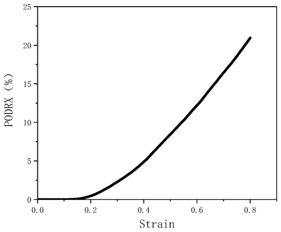 As the rolling process continues, the strain gradually becomes larger. Figure 14 illustrates the relationship between the percentage of dynamic recrystallisation (PODRX) and the strain. It can be seen that when strain accumulates to approximately 0.1, the dynamic recrystallization initiates, and the percentage of dynamic recrystallisation becomes progressively larger as the strain increases.