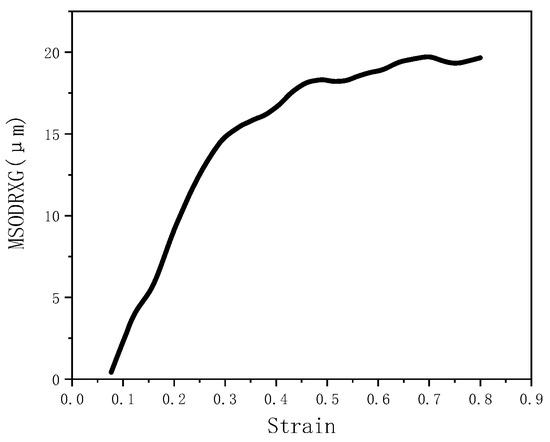 The relationship between the mean size of dynamic recrystallized grain (MSODRXG) and strain is given in Figure 15, from which it can be seen that the mean size of dynamic recrystallized grain size increases with strain and becomes progressively larger. However, when the strain is greater than 0.3, there is a strain region in which the mean size of dynamic recrystallized grain size decreases as the strain increases. This is due to the generation of new grain during the dynamic recrystallization process, and as can be seen in Figure 14, after strain greater than 0.3, the percentage of dynamic recrystallisation changes is significantly faster, which means that the rate of nucleation is accelerating. This causes the mean size of dynamic recrystallized grain to decrease in certain strain ranges due to the smaller size of the larger number of newly generated grains.