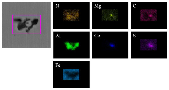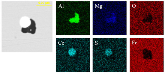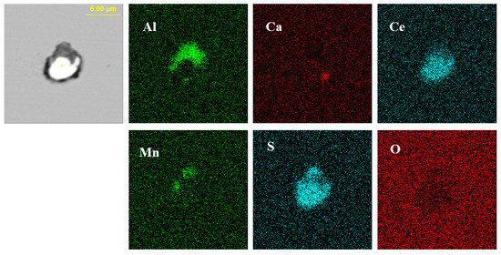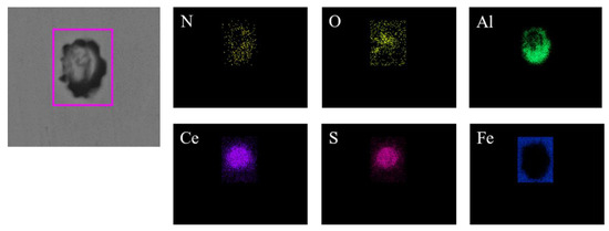 Figure 2 shows the typical morphology and energy spectrum of inclusions in the steel with 10 ppm Ce content. It can be seen that the type of inclusions in the steel was mainly CeAlO3-Ce2O2S-(AlN), where CeAlO3-Ce2O2S are light gray, and AlN in some inclusions was coated with CeAlO3-Ce2O2S. The main morphology of CeAlO3-Ce2O2S-(AlN) inclusions was spherical or ellipsoidal. The elemental mapping of a typical inclusion is shown in Figure 3.