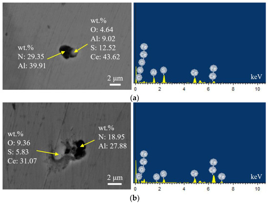 Typical morphology and energy spectrum of inclusions in the steel with 60 ppm Ce content. (a) CeAlO3-Ce2O2S-AlN, (b) Ce2O2S-AlN.