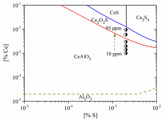 - When the added Ce content was 95 ppm, the composition was located near the boundary between rare earth sulfide and rare earth oxysulfide. The critical Ce content for the conversion between CeAlO3 and Ce2O2S was 41 ppm.