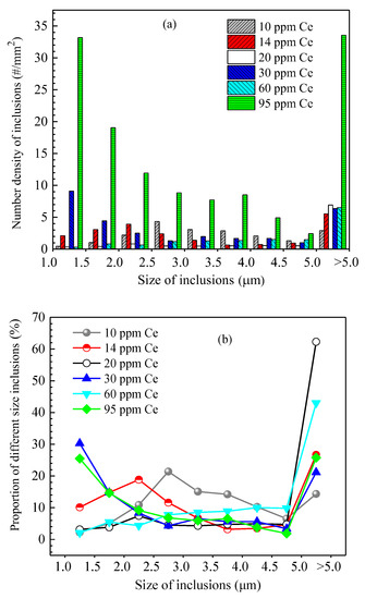 - The difference in the Ce content significantly affected the number density and size distribution of inclusions in the steel. When the added Ce content was 20 ppm, the number density and proportion of inclusions in the steel were lower, and its average size was larger. When the added Ce content increased to 95 ppm, the number density of inclusions in the steel significantly increased.