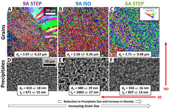 Microstructure characterization of the ECAE-processed samples. EBSD Inverse Pole Figures (IPFs) showing characteristic grain size, distribution, and orientation for (A) 9A STEP, (B) 9A ISO, and (C) 6A STEP. Backscattered electron micrographs showing the precipitate size and spacing for (D) 9A STEP, (E) 9A ISO, and (F) 6A STEP. The sample orientation is shown by the solid arrows in the lower right-hand corner to indicate the extrusion direction (ED) and normal direction (ND). (Figure reproduced with permission from [35]).