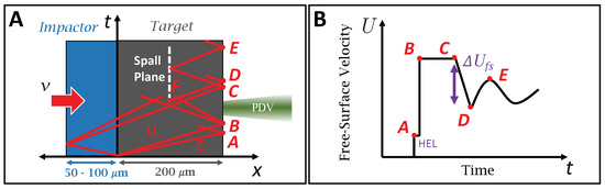 Upon impact (t = 0, v = v), compression shock waves initiate and propagate into the impactor and the target. When the compression wave interacts with a free-surface, it reflects as a rarefaction fan; this occurs first at the impactor’s free surface. Moreover, when the compression wave in the target reaches the target’s free-surface, we observe a corresponding increase in velocity. We depict a two-wave structure (an elastic precursor followed by a plastic shock) propagating through the target in Figure 3B. The elastic precursor propagates at the longitudinal wave speed, , followed shortly after by the plastic shock traveling at the shock speed . The stress level corresponding to the velocity at point A represents the Hugoniot Elastic Limit (HEL), which defines the dynamic elastic limit of the material in the uniaxial strain condition. Depending on the target thickness, impact velocity, wave speeds, and PDV signal quality, the elastic precursor may not be observed.