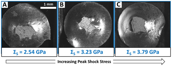 Macroscopic optical images of the damage surface provide a more complete picture of the dynamic failure process within the LDMF experiments. The macroscopic damage morphology was examined for all six sample sets and for all three impact orientations in each case (note all of these observations represent the post-mortem observations for loading over similar times). Only a subset of results are shown in the following figures, with a more comprehensive set in Appendix A in Figure A3 and Figure A4. For each material, the damage morphology was not found to change substantially with shock stress over the small range of imposed shock stresses in these experiments. This is illustrated in Figure 6 with sample 9A ISO ED where similar macroscopic damage morphologies are visible across this shock stress range.