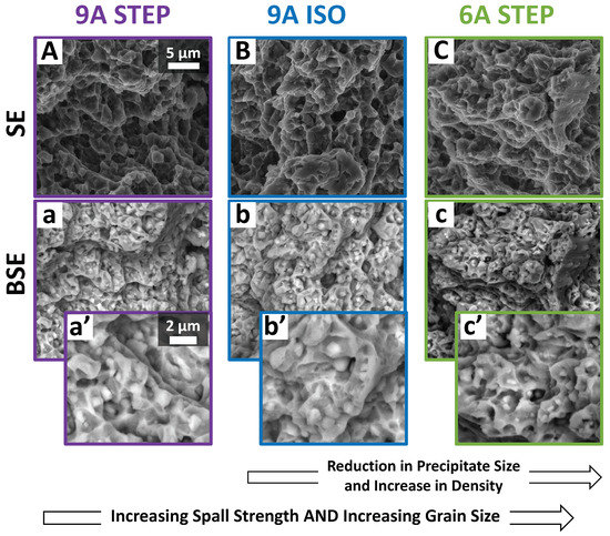 High-resolution SEM failure surface images of representative specimens from ECAE-processed sample sets. Each column depicts a specimen from a single sample set: (left) 9A STEP, (center) 9A ISO, and (right) 6A STEP. Micrographs are shown from (A–C) secondary electrons (SE), (a–c) backscattered electrons (BSE), and (a’–c’) magnified BSE. Frame (A) shows the scale bar for (A–C) and (a–c), and Frame (a’) shows the scale bar for (a’–c’).