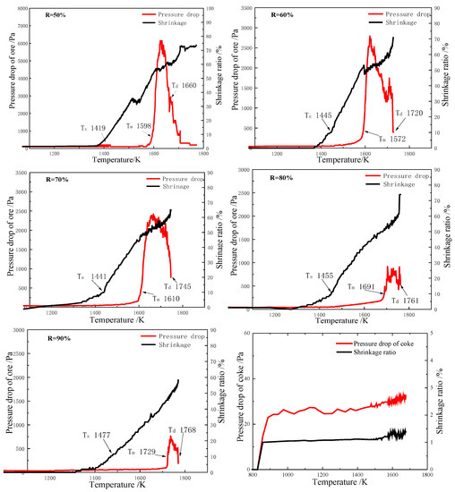 The trend of the temperature-pressure-drop curve of the softening-and-melting experiment was very consistent with the results in the literature [9,10], and the values were also very close to each other. The curve in Figure 1 shows that the pressure drop and the shrinkage of the coke layer did not change significantly. This explains why coke can play the roles of supporting the material column and maintaining the channel of the upward flow of gas and the downward flow of molten iron, especially in the high-temperature region in the middle and lower parts of BFs.