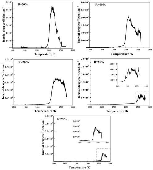 With the increase in temperature, the iron ore layer gradually softens and melts. The appearance of the liquid phase worsens the permeability of the ore layer and significantly increases the inertial resistance coefficient in the temperature range of 1600–1800 k. When the liquid phase begins to drip, the channel for the gas flow opens and the inertial resistance coefficient decreases immediately. The inertial resistance coefficient decreases with the increase in the iron ore pre-reduction degree from 50% to 90%. This is because, on the one hand, the more fully the iron ore is reduced, the less the slag phase will be generated and, consequently, the more difficult it is to generate low-melting-point materials. On the other hand, the melting point of iron is much higher than that of the low-melting-point ore material. Therefore, the more complete the pre-reduction of the iron ore, the higher the melting point of its layer, resulting in rapid dripping after melting and shortening the dripping temperature range.