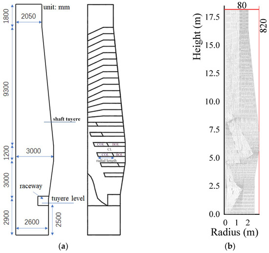 Schematic of BF geometry (a) and grid diagram (b) (R = 50%, in mm). COL: cohesive ore layer, BOL: bulk ore layer, CL: coke layer.