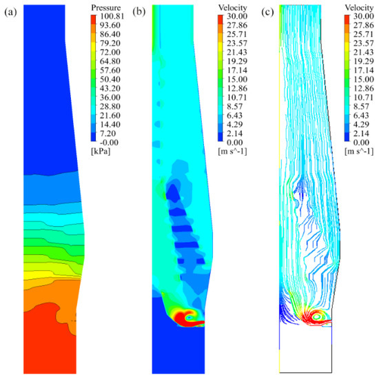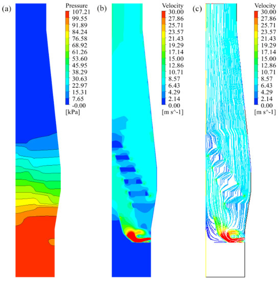 Contour and path line of traditional BF (without central coke, R = 50%, = 60°, n = 6): (a) pressure contour, (b) velocity contour, and (c) path line.