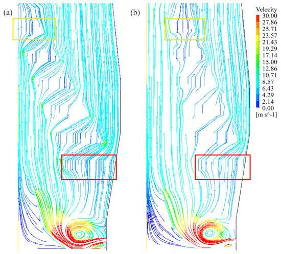 Charging more coke into the central region is commonly used by industrial BFs to reduce the in-furnace pressure drop. In this section, we study the whole-furnace pressure drop and the gas flow velocity of the traditional BF process (R = 50%), with and without charged central coke. In this way, it is feasible to verify the accuracy of the 2D porous model. The whole-furnace pressure drop (107.21 kPa) without coke enrichment in the center is consistent with the present-day 500 m3 BF. The whole-furnace pressure drop with central coke charging is 100.81 kPa, which is lower than that when central coke is not considered and reflects the effect of the central coke operation in reducing the whole-furnace pressure drop. This verifies the reliability of our 2D porous model. In order to clearly display the speed distribution in the low-speed region, areas with gas flow velocity ≥ 30 m/s are all configured to red.