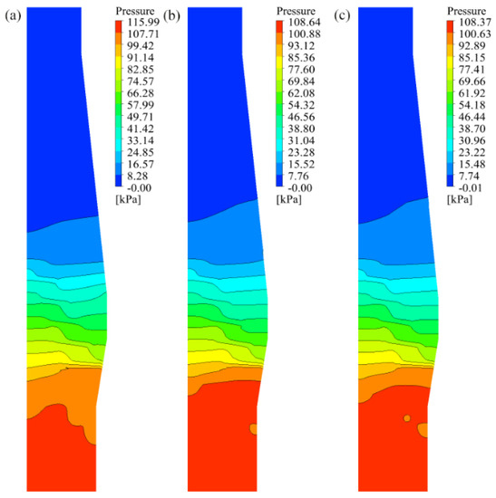 Pressure contour of three stack tuyere heights (R = 60%, blast velocity = 23 m/s): (a) H = 0.0 m, (b) H = 1.8 m, (c) H = 3.6 m.
