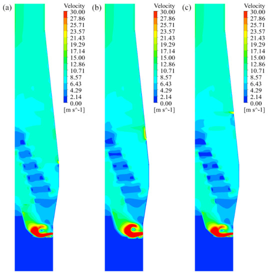 Velocity contour of three stack tuyere heights (R = 60%, blast velocity = 23 m/s): (a) H = 0.0 m, (b) H = 1.8 m, (c) H = 3.6 m.