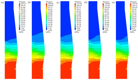 Pressure contours of different pre-reduction degrees (= 60°): (a) R = 50%, n = 6, (b) R = 60%, n = 6, (c) R = 70%, n = 7, (d) R = 80%, n = 8, (e) R = 90%, n = 9.