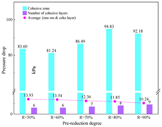 The results of different pre-reduction degrees are shown in Figure 9. As shown in Table 5, the coke layer becomes thinner when the indirect reduction degree increases from 50% to 90%. Therefore, when the cohesive zone inclination remains at 60°, the number of burden layers in the cohesive zone increases to 7, 8, or 9 for reduction degrees of 70%, 80%, or 90%, respectively, with the result that that the pressure drop of the cohesive zone and the whole furnace still increases gradually, from 107.21 kPa to 118.59 kPa, even if the resistance coefficient of the COL decreases.