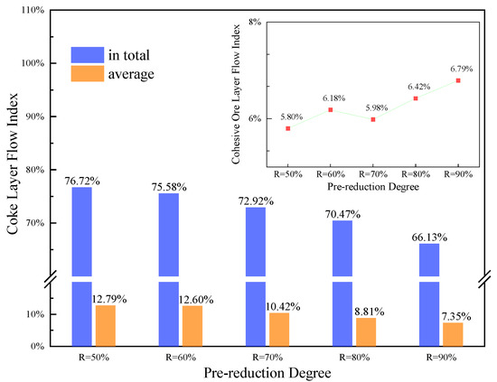 Figure 11 shows the data of and . descends from 76.72% to, at most, 66.13% with the increase in the pre-reduction degree. This means that the majority of the gas still flows through the coke layer. Coke keeps playing the key role of the channel for the reducing gas in the TGR-OBF. The decrease in also illustrates that about 10% of the gas flow can permeate through the ore layer rather than the coke layer. Therefore, compared with a conventional BF, the permeability in the TGR-OBF does not deteriorate badly before the drippage of pig iron.