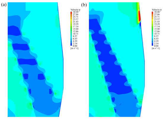 indicates that gas flows around 5~7% can still pass through the COL, even when the ores have already softened and melted. Figure 12 shows that the y-direction velocity of the gas flow in the COL and its adjacent region is much slower. For the pre-reduction degree of 50%, the gas velocity in the CL is 4.29 m/s, which is about twice that of the COL. For the pre-reduction degree of 90%, an equalization of velocity in the COL and CL regions can be found, as shown clearly in Figure 12. This shows that with the increase in the indirection degree, the permeability of the cohesive zone is improved, and the capacity for gas flowing is enhanced. These changes are significant in reducing the pressure drop, increasing the coal rate, reducing the coke rate, and improving the performance indicator of a BF.