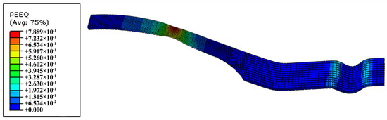 To verify that the material will induce stress in the thickness direction during the deformation process, the finite element simulation of uniaxial tension and hemispherical bulging is carried out. The equivalent plastic strain (PEEQ) results obtained by the finite element simulation are shown in Figure 1 and Figure 2. The material used for the simulation is Trip 780, and the thickness of the sheet is 1 mm. In order to confirm the actual conditions of sheet deformation, a solid element is selected which is more precise.
