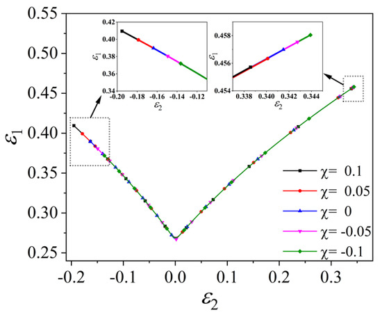 For the MMFC instability criterion, when the thickness direction stress is not considered, the change of the r hardly changes the slope of the curve, but significantly affects the length of the curve. The FLC of the tension and compression zone increases with the increase in r , and the curve of the biaxial tension zone becomes shorter as the r increases, as shown in Figure 16. For this, the C-H instability criterion shows the same. The difference is that the r significantly affects the slope of the biaxial tension zone on the right side of the curve, as shown in Figure 17. The value of r increases and the slope decreases, indicating that the normal anisotropy is more pronounced, and the easier the material reaches the forming limit.