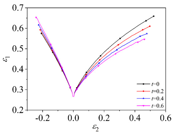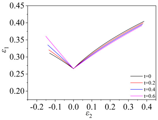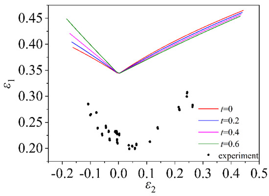 As shown in Figure 21 and Figure 22, considering the induced stress in thickness direction during the deformation process, as the value of t increases, and the forming limit curve gradually moves closer to the experimental data. It is shown that after considering the induced stress in the thickness direction, the material forming is indeed closer to the actual forming conditions, and the accuracy of the theoretical forming limit curve is improved.