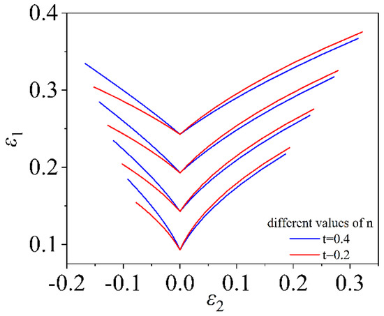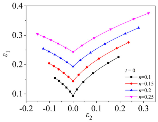 The strain hardening index n is the strain-strengthening ability of the material during deformation. The larger the value of n , the stronger the strain-hardening ability. Figure 13 and Figure 14 show the FLD for different values of n based on the Mises yield criterion and the MMFC instability criterion. The forming limit curve shifts upwards significantly as the value of n increases and the range of forming limits increases. Considering the induced stress in the thickness direction does not significantly change the effect of the n on the forming limit, only affecting the overall change of the curve, as shown in Figure 15.