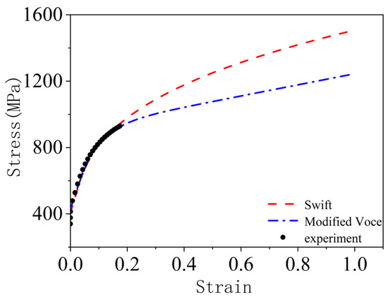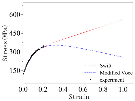 Even with a more accurate anisotropic yield function, the stress-strain relationship plays an important role in forming limits [22]. The two flow stress-strain relationships described in this paper, Swift stress-strain relationship and modified Voce stress-strain relationship can accurately describe the deformation behavior of uniform strain, but the resulting forming limits are very different. Therefore, in calculating the sheet forming limit, in addition to choosing the appropriate yield criterion, an appropriate stress-strain relationship should be used.
