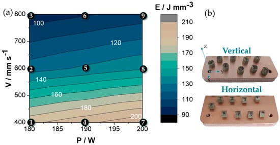 (a) DOE representation of fabricated samples varying scan speed (V) and laser power (P) laser. The right column represents the volumetric energy density (E). (b) Real image of specimens fabricated in vertical and horizontal orientation with respect to the building platform. A graphical representation of DOE, which has 9 experimental points (enumerated in the figure) and the visual appearance of the as-build specimens is shown in the figure.