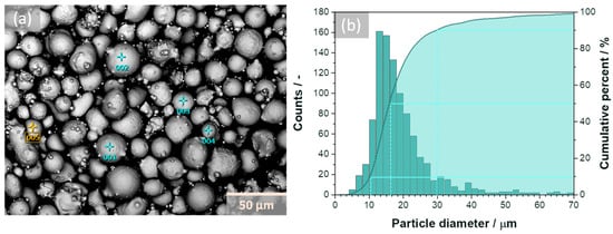 Characterization of the Cu-Al-Ni-Fe feed powder: (a) Morphology as seen in FE-SEM and (b) particle size distribution.