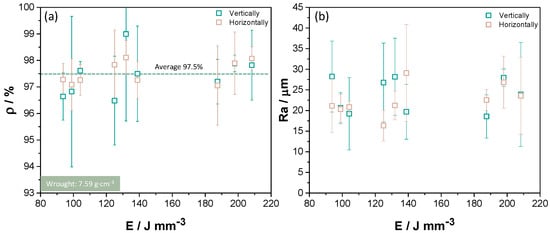Figure 3 shows the relative density and the average surface roughness (Ra) measured on samples printed vertically and horizontally. All samples reached a relative density of 97.5% under a wide energy density window, which is relatively high compared to the 100% of the wrought material, whose density is 7.59 g·cm−3 [,]. There is a higher variability of the error bars of the vertical samples compared with horizontal ones, traducing into a slightly higher relative density. The values are consistent with the literature data. Gustmann et al. [] reported that Cu–11.85Al–3.2Ni–3Mn and Cu–11.35Al–3.2Ni–3Mn–0.5Zr alloy fabricated by LPBF through SLM (volume energy density of 30 and 50 J·mm−3) reach 99 to 100% in the relative density. Murray et al. [] reported that Cu-9.8Al-5.2Ni-4.6Fe-0.3 Mn (wt%) fabricated by LPBF through SLM (volume energy density between 97 to 257 J·mm−3, variable laser power, and scan rate) result in 90 to 99.5% relative density.