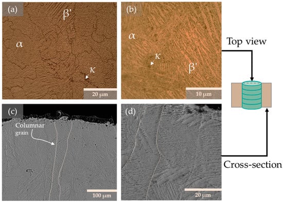 Figure 4 shows the micrographs obtained by optical microscope and FE-SEM images of samples fabricated with 125 J·mm−3 and vertically oriented. The grain size is close to 30 μm, and some structures show the typical morphology of the martensite (β′) phase, which is acicular in shape []. This observation is consistent with the literature data. Shen et al. reported similar microstructure in Cu-Al-Ni-Fe alloy fabricated through wire-arc additive manufacturing (WAAM); in particular, the presence of equiaxed grains of Widmanstätten α-phase and martensitic β′-phase. Additionally, they detected the presence of columnar grains associated with the layer-by-layer deposition of the alloy. These features are also visible in FE-SEM micrographs of the cross-section, as columnar grains and characteristic microstructure of the β′ phase (see Figure 4c,d).