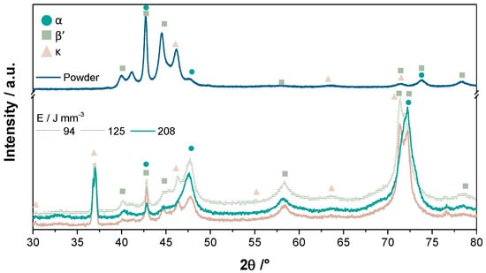 Figure 5 shows the X-ray diffraction patterns of the alloy powder and as-built samples. The powder diffraction demonstrates the solid solution formation from all the alloying elements. It is also possible to observe that it is mainly composed of a cubic α-Cu (111) and β′ martensite phases, most likely formed during the atomization process []. As-built samples exhibit similar diffraction patterns, mainly composed of martensite phases β′ (orthorhombic and monoclinic) and an α (cubic) phase [,]. The β′-martensite is a nonequilibrium phase typically associated with a high cooling rate, such as quenching, which suppresses the formation of equilibrium phases by the diffusion of the alloying elements. The monoclinic structure is associated with the space group P21/m, while the 18R is the orthorhombic associated to the ordered martensite [,,]. The presence of martensite is feasible in additive manufacturing due to the rapid cooling generated from the melt pool supported on the cooler bulk and its subsequent solidification []. Pisarek has described the hypo-eutectoid phase transformation of Cu-Al-Fe-Ni, identifying the crystallizing phases regarding the cooling rate []. The typical phases in thermodynamical equilibrium in this type of alloy are α (space group Fm/3m), γ, and κ. In our case, the XRD data indicates the presence of martensite, α, and κ phases. The intermetallic κ combines Fe3Al (space group Fm/3m) and NiAl (space group Pm/3m) phases reported in the literature as fostering hardness and mechanical resistance [].