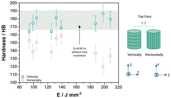 Figure 6 shows the hardness of the top face of as-built samples fabricated vertically and horizontally as a function of volumetric energy density. Samples fabricated vertically in the whole E range exhibit a higher hardness than horizontal samples, and their values are in the range of wrought Cu-Al-Ni-Fe []. The low horizontal hardness agrees with similar values of the same alloy obtained as-cast, ranging from 140–150 HB []. This is because the as-cast samples, unlike the wrought samples, are inhomogeneous and have more internal defects [].