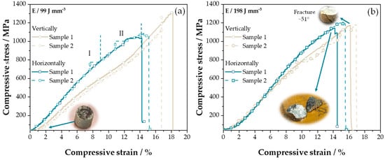 Figure 7 shows the compressive stress-strain curves of samples fabricated vertically and horizontally with an E of 99 and 198 J·mm−3. It should be noted that the latter shows two tests completed on different specimens, one depicted by a continuous line and the other by a dashed line, to demonstrate the reproducibility of the test. The first stage (I) shows the elastic deformation until around 800 MPa, where it is possible to observe a slope change corresponding to plastic deformation (stage II) []. The low plastic deformation supported by the alloy could be related to the martensite phase, which caused a brittle intergranular fracture, well observed by the sample and its ~51° fracture. As observed, samples fabricated vertically demonstrated a better mechanical performance than horizontally, exhibiting a higher strength and compressive strain, which is also related to the length of the scanning vectors. In the vertical position, the scanned areas are lower, hence the solidification rate.