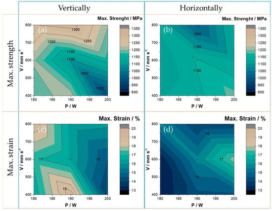 Summary of maximum strength and strain extracted from compression test as a function of laser parameters. (a,c) Vertically and (b,d) horizontally samples.