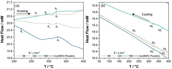 Figure 9 shows the exothermic and endothermic curves of Cu-Al-Ni-Fe as powders and the as-built samples. DSC (differential scanning calorimetry) results show the transformation temperature of β′ (M) and austenite phase (A) []. The temperatures are highlighted for each curve for the stable phase transformation start and finish as As and Af, respectively. In contrast, the martensitic transformation temperature of start and finish was denominated as Ms and Mf. The results revealed that the observed peaks tended to be sharped between 250 °C and 350 °C in heating and 300 °C to 350 °C in cooling. The latter is due to different intermetallics types or phases that limit the stability of the low-temperature phase and result in an individual transformation [,]. Marques de Araujo et al. [] studied the Cu-Al-Ni-Fe and its shape memory effect capability through phase transformation by adding Cu, Al, and Ni. They found that the original alloy had no response to DSC tests, but adding Al to the alloy promoted thermoelastic transformation. Therefore, modifying by adding other elements or heat treatments [] is required to intensify the phase transformation response and shape memory properties.