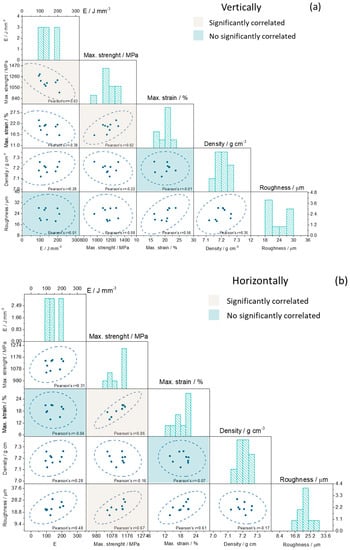 Scatter matrix graph of the correlation between the energy density (E) with intensive and mechanical properties measured of (a) vertical and (b) horizontal as-built samples.
