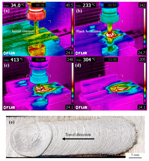 Analysis of the deposition process and final coating: (a) initial contact between consumable rod and substrate sheet, (b) flash formation at the consumable rod tip, (c) deposition, (d) retraction of the consumable rod and cooling and (e) top view of the as-deposited AA6351 coating obtained after friction surfacing on a AISI 1020 low carbon steel substrate.