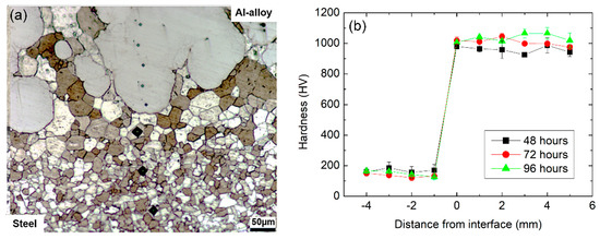 The diffusion treatment also led to a significant hardness increase in the coating relative to the initial as-deposited condition, with average hardness values of 959 ± 37, 1010 ± 24 and 1037 ± 35 HV obtained after 48, 72 and 96 h, respectively, as shown in Figure 4b. The elevated hardness values observed suggest the formation of Al-rich intermetallic phases such as FeAl3, FeAl2 or Fe2Al5 in the coating [33,37,38]. For all heat treatment times, coating hardness was found to be consistently superior to 900 HV, with an observable increase in hardness for the longer diffusion times of 72 and 96 h in comparison to the 48 h treatment. Furthermore, hardness in the coatings is relatively uniform, indicating homogeneity in the eventual formation of intermetallic compounds through coating thickness. It is also noted that the heat-affected zone on the substrate extends for approximately 0.15 mm.