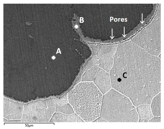 Detailed cross-section analysis of the substrate/coating interface by SEM/EDS after heat treatment at 550 °C for 96 h (BSE imaging mode): coating (spot A), interface layer (spot B) and substrate (spot C).