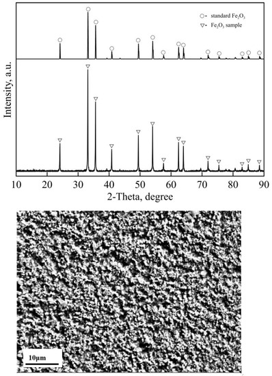 The powder was mixed with 7% distilled water and compacted with a pressure of 10 MPa to form cylinders with a diameter of 10 mm, a height of 14 mm and weight of 3 g. The cylinders were then dried at 105 ± 5 °C for 4 h. The phase analysis of the initial sample was obtained using X-ray diffraction (XRD) with an Ultima-IV apparatus (3 KW, 40 kV/40 mA, Cu, λ = 1.5406 Å) manufactured by Japanese Neo-Confucianism, and the morphology was examined at 1000× using a scanning electron microscope (SEM; Carl ZEISS NTS, JSM-6510, 20Kv, WD = 10.0 mm), as shown in Figure 1. Upon comparison of the X-ray diffraction pattern of the sample with the standard defined by the National Bureau of Standards [29], it was confirmed that the sample was high purity hematite. Sample preparation for SEM was carried out by mounting the sample in epoxy resin, using a 2:1 ratio of resin to coagulant, and then polished with sand paper and diamond polishing paste, avoiding any overheating which could modify the original texture.