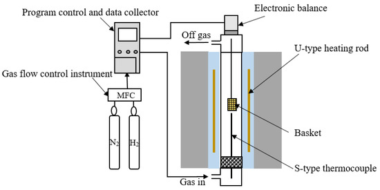 All experiments were carried out under isothermal conditions. Initially, the furnace was heated using 3Nl/min of high-purity nitrogen. After reaching the specified reduction temperature, the samples were kept at this temperature for 5 min before H2 was introduced at a flow rate of 3.0 Nl/min. After the weight of the sample remained constant, it was cooled to room temperature under the protection of nitrogen. The temperature range of the experimental work was from 600 to 1050 °C at temperature intervals of 50 °C.