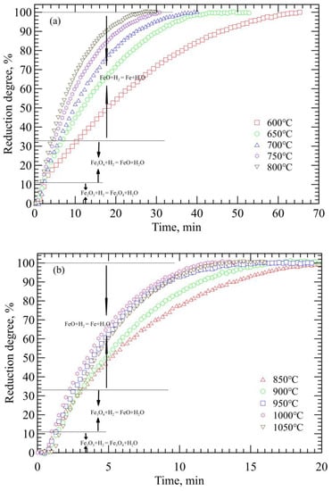 Reduction degree of pure hematite with hydrogen. (a) 600–800 °C; (b) 850–1050 °C.