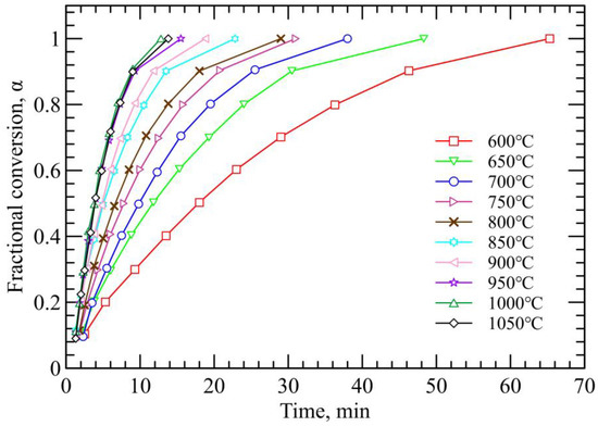It is clear from the changes in the slope in Figure 3 that there are three reaction mechanisms during the conversion of hematite into metallic iron. The activation energy increases, with the highest value for the last stage of conversion. Under similar conditions, and for the reduction of pure hematite with hydrogen, El-Geassy et al. [33] reported an activation energy of 28.7 kJ/mol for the first stage of reduction in the temperature range from 700 to 1050 °C, increasing when the reduction degree was higher than 70% to 59.6 kJ/mol in the temperature range from 700 to 900, and 168.4 kJ/mol when the temperature was further increased from 950 to 1050 °C. The values on activation energy are highly variable because they depend on the specific experimental conditions. For example, for the conversion of hematite to magnetite a range from 33.28 kJ/mol to 139.2 kJ/mol has been reported [34], indicating different reaction mechanisms. Table 2 provides a short summary of activation energies for the reduction of iron oxides. It can be observed that, for the same reducing gas and temperature range, the activation energy can be significantly different due to changes in porosity [35].