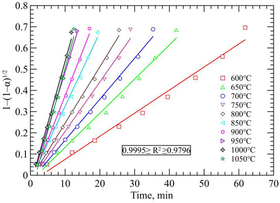 There are a significant number of kinetic models. The values of kt are fitted with a model, considering in principle that all models can fall into three different groups [39]: accelerating, decelerating and sigmoidal. Reduction falls in the group of decelerating models. Figure 7 shows that the current experimental data can be described by the contracting cylinder model: