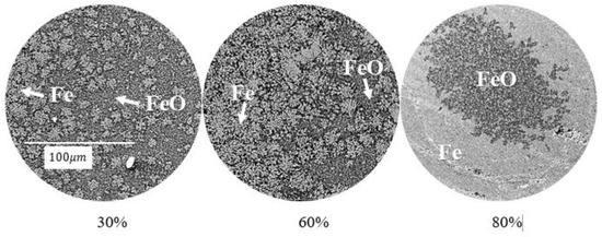 Morphology at a constant reduction temperature of 950 °C and three stages of reduction (30%, 60% and 80%). Note: The bright color is Fe and the gray color is FeO.