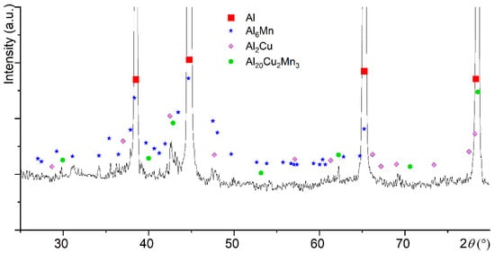 The XRD data for as-cast sample (Figure 1) suggested the solidification of the aluminum-based solid solution (Al) and several secondary phases of CuAl2, Al20Cu2Mn3, and Al6Mn. Owing to a small fraction of the secondary phases in the studied alloy, the precise identification of the secondary phases by XRD method was difficult and microstructural investigations was involved. Meanwhile, the suggested phases are agreed to Al-Cu-Mn phase diagram [43] and Thermo-Calc simulation [18].
