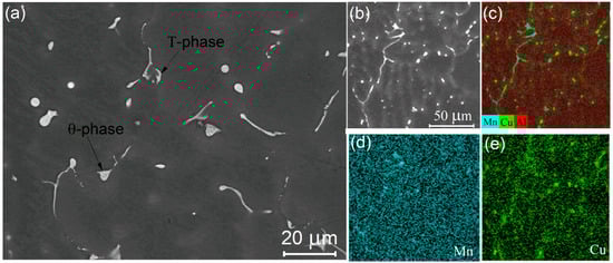 (a,b) The as-cast microstructure of the Al-2%Cu-2%Mn alloy, (c) EDS layered image, (d) Mn-distribution map, and (e) Cu distribution map for image in (b).