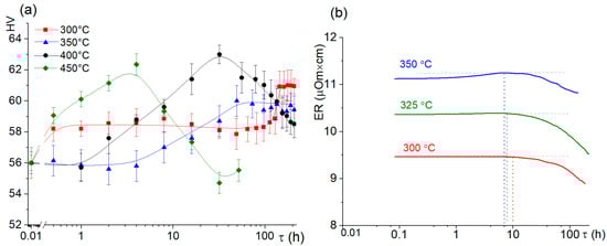 During aging at 300 °C the hardness slightly increased at the beginning of annealing (Figure 3a). An increase in time above 96 h led to an additional hardening effect, and hardness values stabilized after ~148 h of aging. Heat treatment at 350 °C led to hardening in a range of 8–48 h and stabilization of HV values at larger time. After aging at higher temperature of 400 °C, HV-time curve had a maximum at 32 h. Similarly, at 450 °C, hardness grew during aging for 4 h and then decreased. The evolution of electrical resistance was studied in-situ at 300, 325, and 350 °C (Figure 3b). The electrical resistance insignificantly changed up to 7–10 h of aging and continuously decreased with a further increase of aging time.